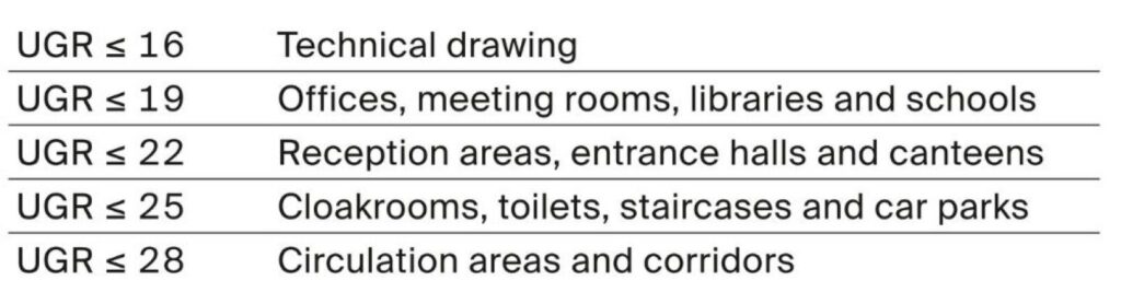 Für Arbeitsplätze in Innenräumen empfiehlt die Norm EN12464-1 die maximalen UGR-Werte für verschiedene Anwendungen, wobei Abweichungen von weniger als 3 nicht signifikant sind.