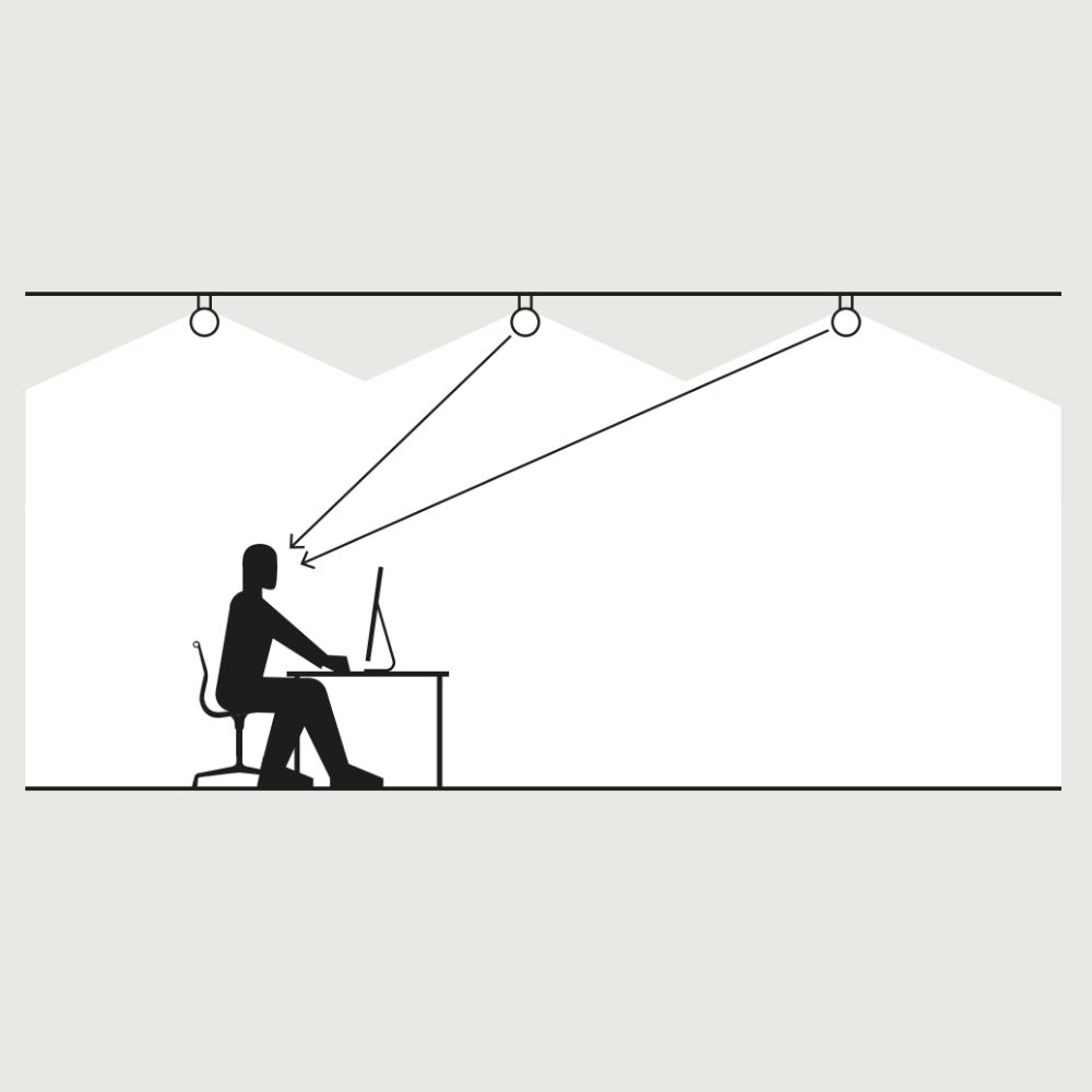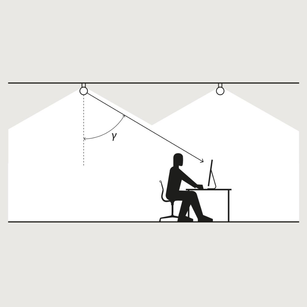 Für die Arbeit am Computer legt die Norm EN 12464-1 Grenzwerte fest, um störende Reflexionen auf vertikalen Bildschirmen zu vermeiden. Es wird der Wert L65° verwendet, der der mittleren Leuchtdichte der Leuchte entspricht, gesehen unter einem Erhebungswinkel γ zwischen 65° und 90° und in allen radialen Richtungen um die Leuchte herum.