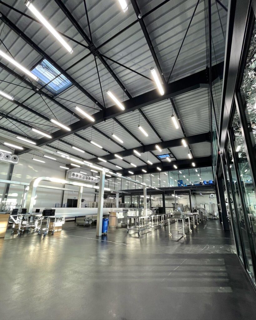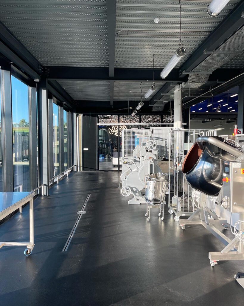 Die Lichtleistung der Leuchten garantiert eine kontrollierte Helligkeit, die für die sorgfältige Verarbeitung von Schokolade unerlässlich ist, und bietet gleichzeitig einen optimalen Sehkomfort für die Handwerker. Das schlichte Design und die Robustheit der Geräte fügen sich harmonisch in die industrielle Ästhetik des Ateliers ein und heben die rohen Materialien wie Beton, Stahl und Glas hervor.