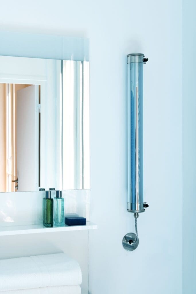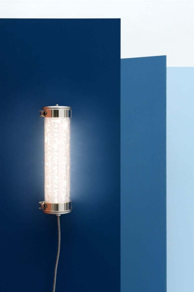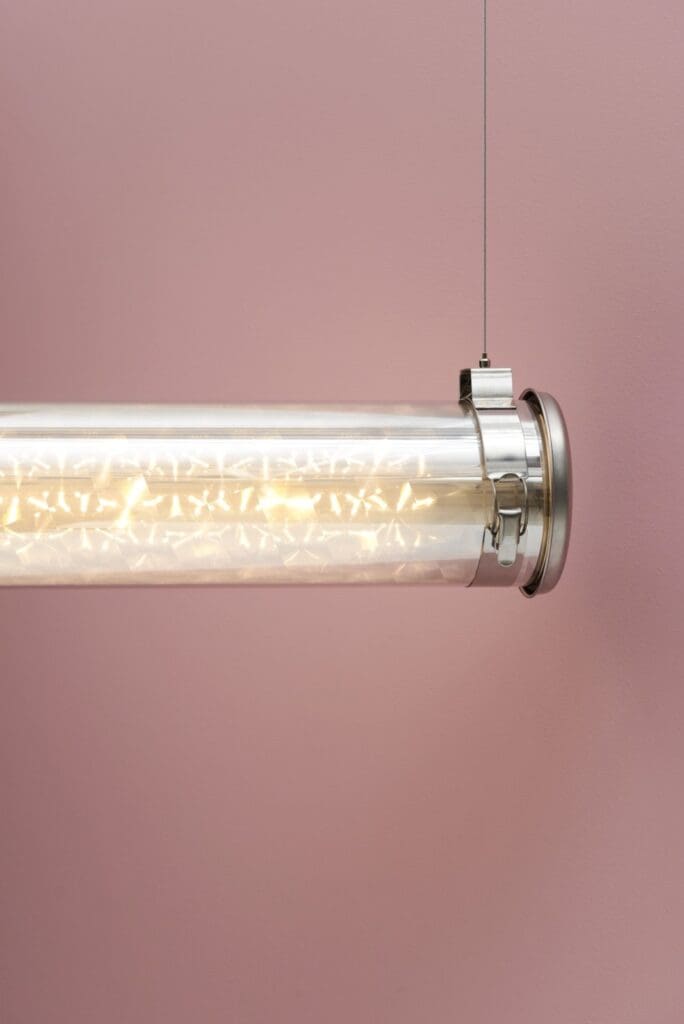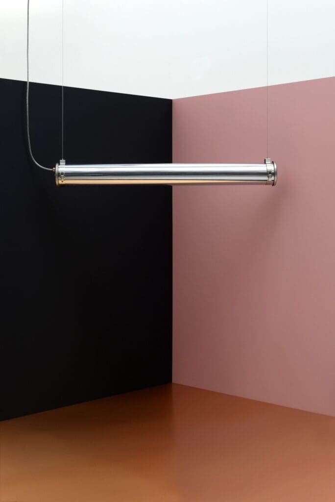 The first sketches for the Lö collection, produced in 2016, reproduced the photographs directly onto a translucent film to be inserted into the Sammode tube. Research then focused on the prismatic effects of the light reflected by the glass, leading to the choice of a reticulated film. The resulting luminaire has a unique duality: with two superimposed translucent films – one prismatic, the other mirror-like – it offers two distinct aspects. When switched on, it diffuses sparkling prisms ad infinitum, while when switched off, it reflects the surrounding environment.