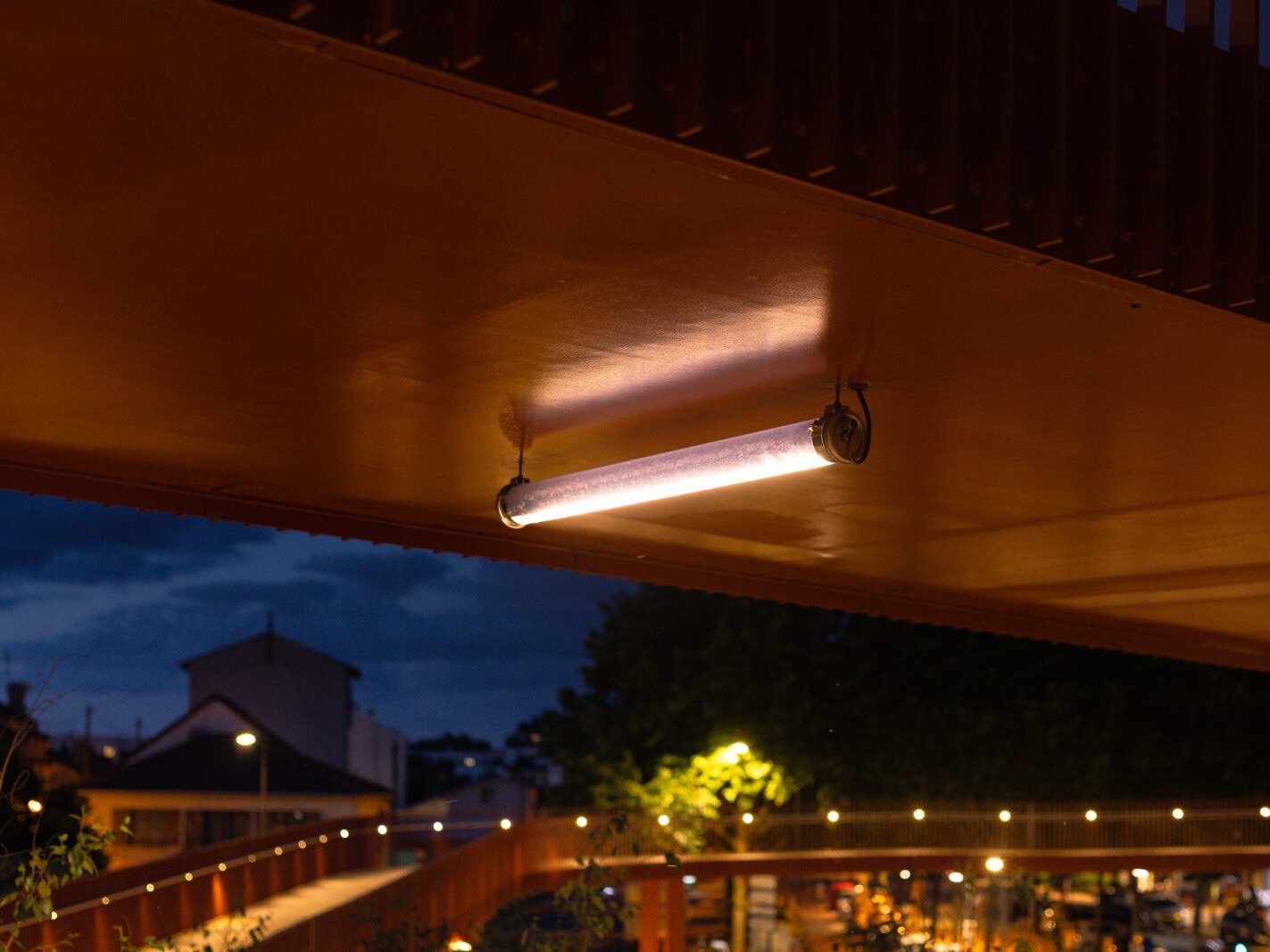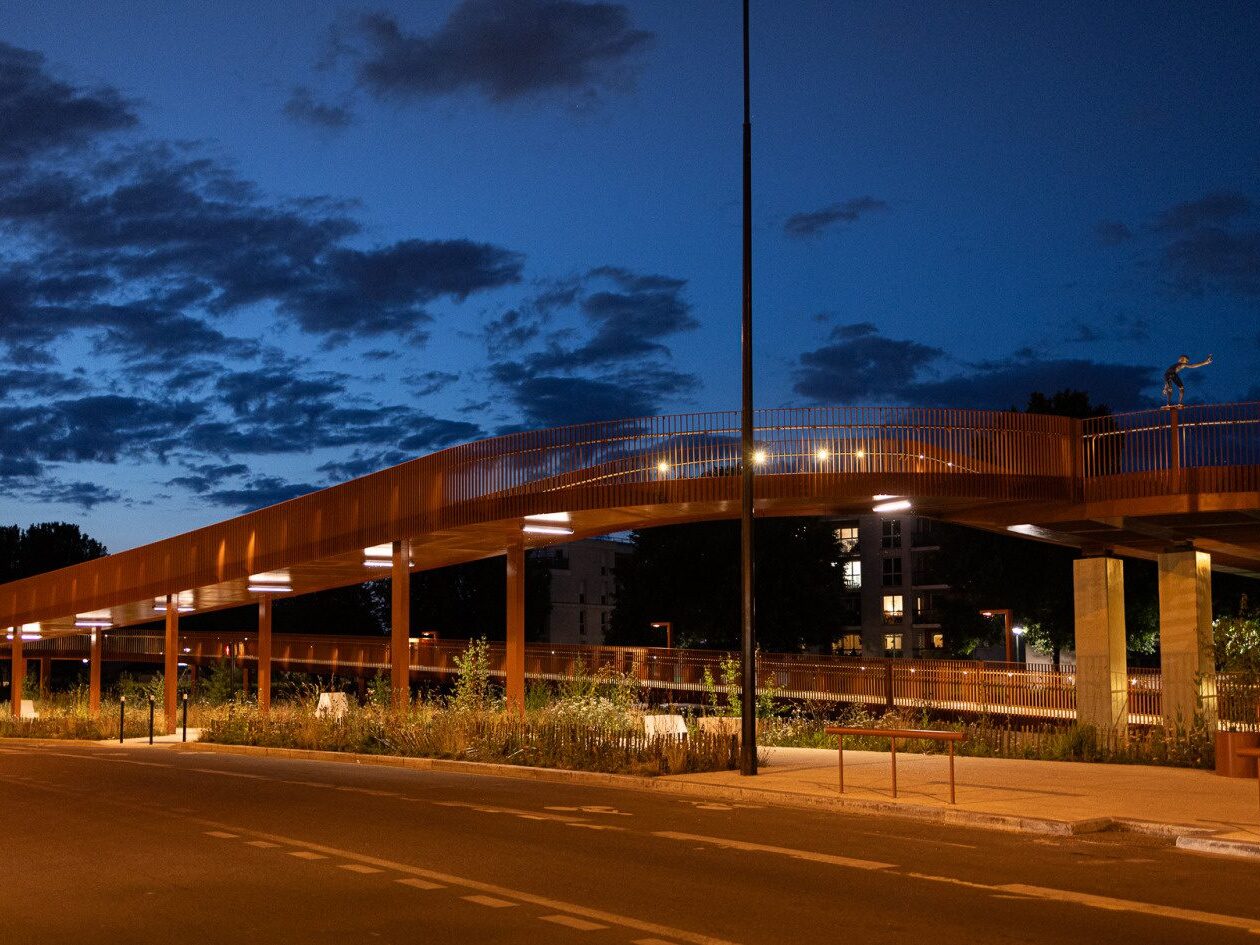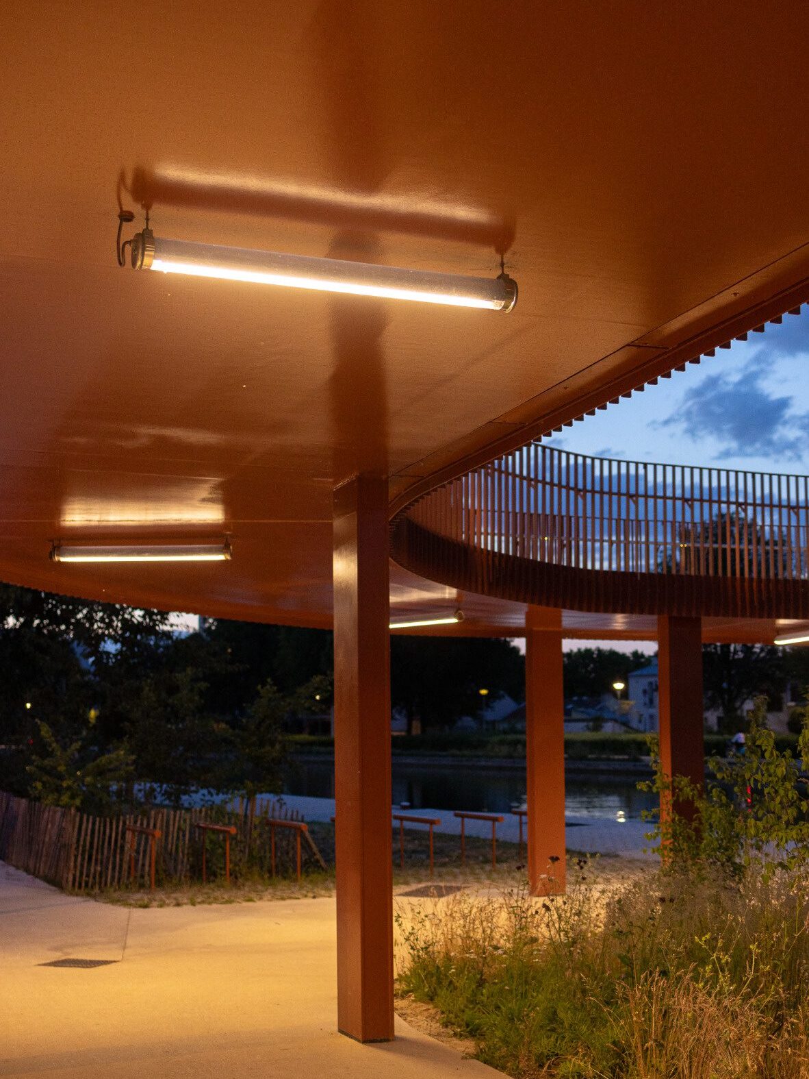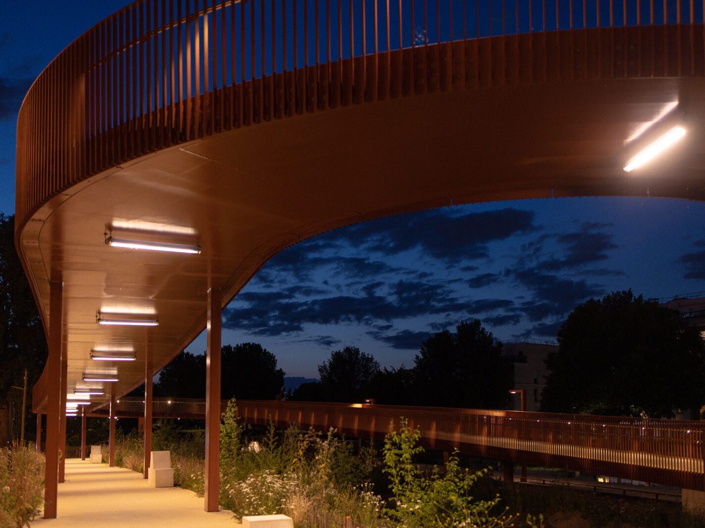 Lighting accompanies this desire for openness and fluidity. It provides a discreet but effective presence, guiding movement while avoiding glare. The light emphasizes the bridge’s lines without dominating them, creating a soft, reassuring atmosphere at dusk.