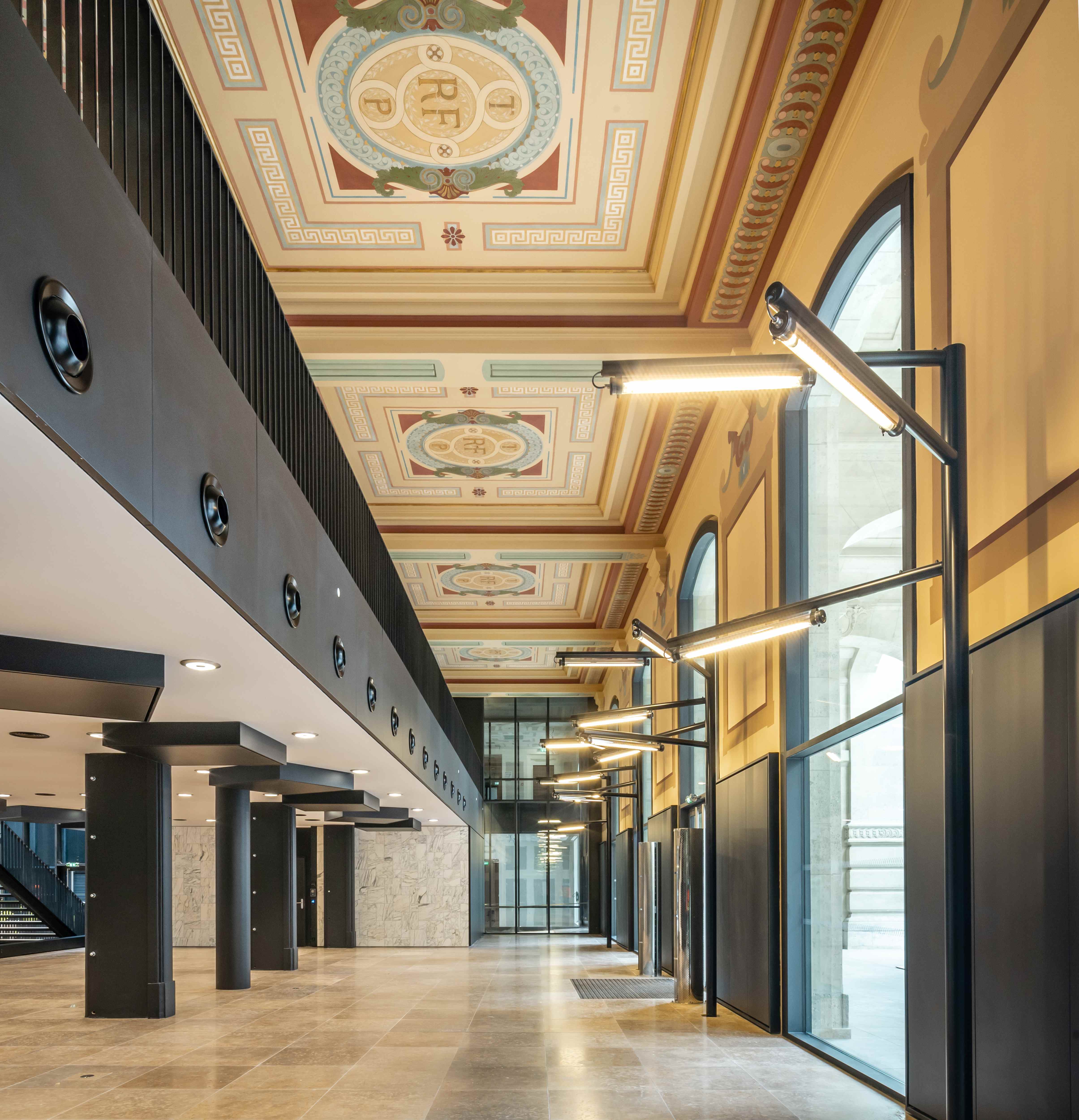 In the corridors, monumental halls and workspaces, lighting dialogues with transparencies and the play of reflections, providing clear pathways while respecting the building’s industrial identity.