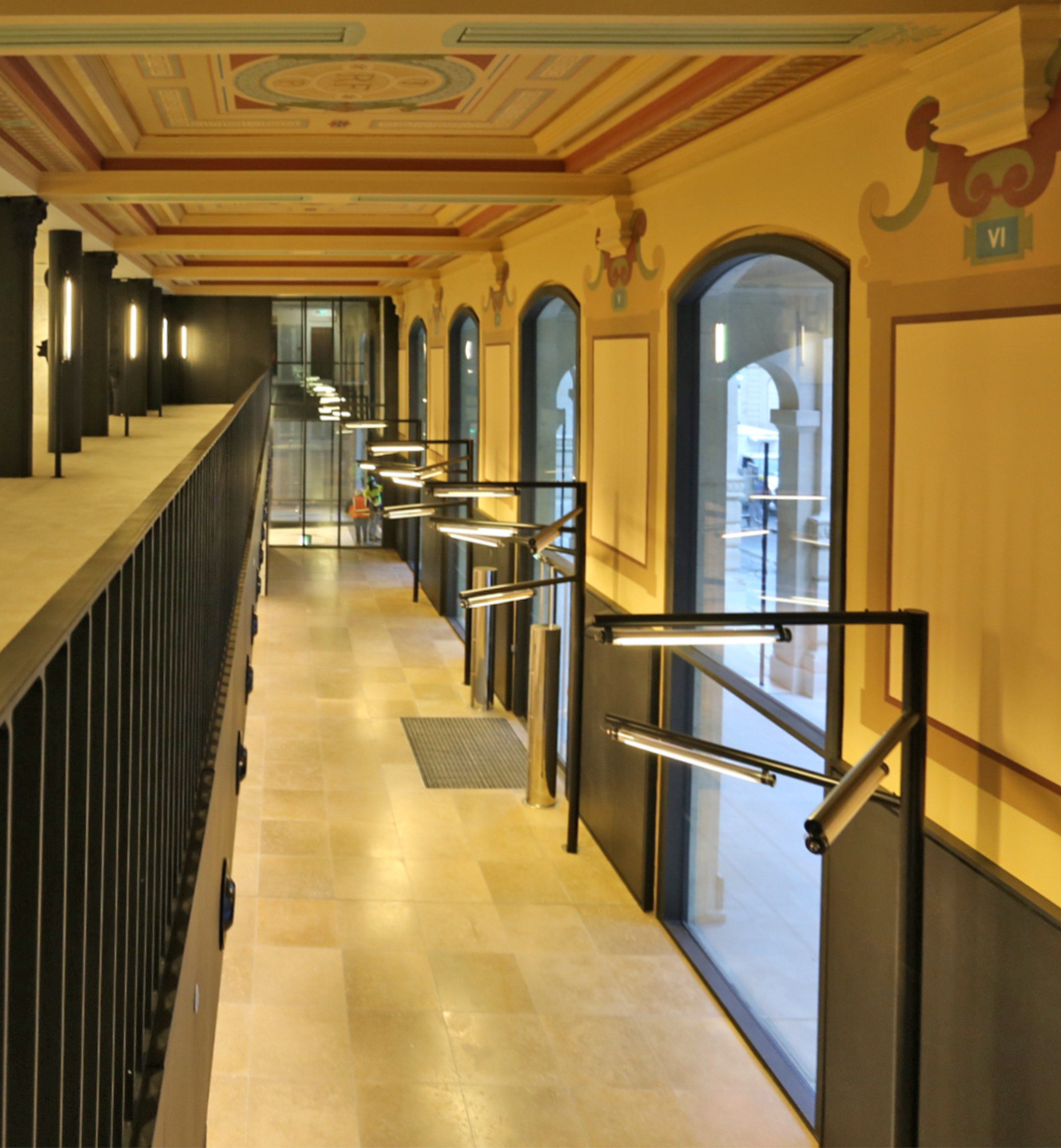 In the corridors, monumental halls and workspaces, lighting dialogues with transparencies and the play of reflections, providing clear pathways while respecting the building’s industrial identity.