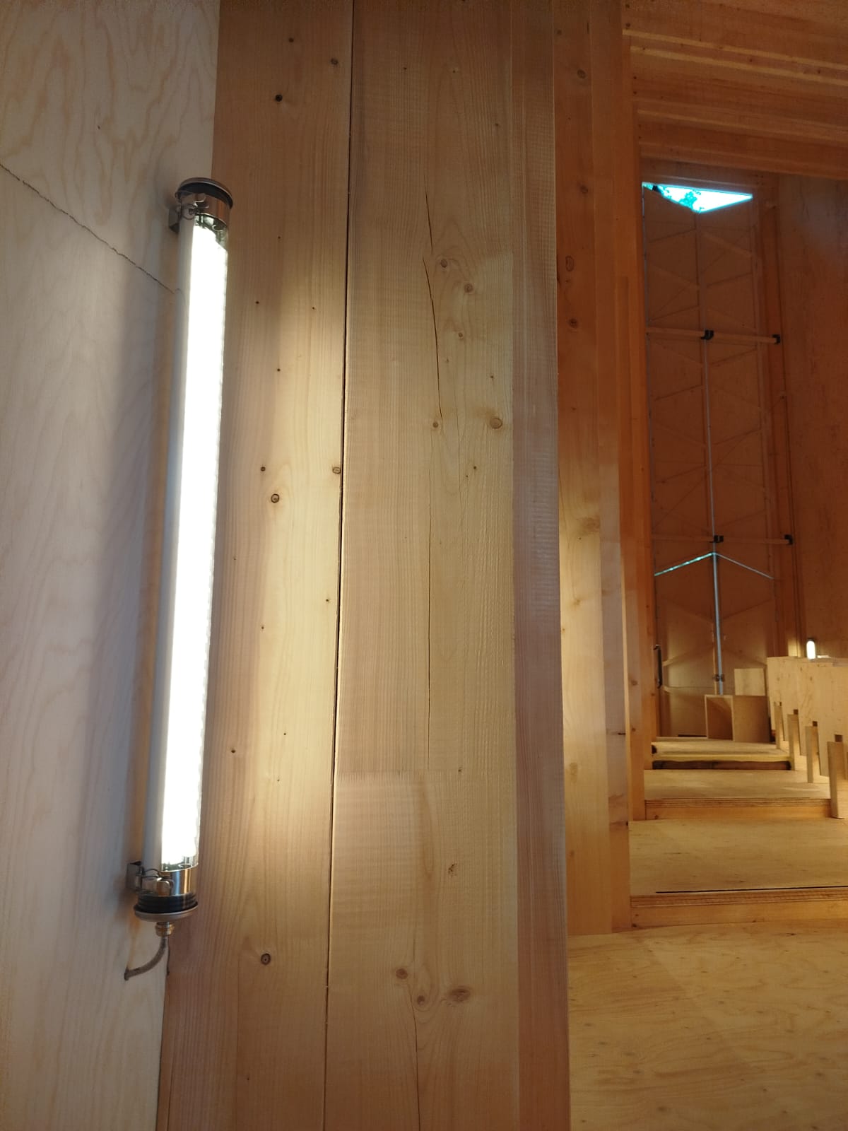 To accompany this light, vertical architecture, Sammode developed a lighting solution in keeping with the project’s intent. In the lower section, the Elgar luminaire underlines the rhythm of the structure, drawing lines of light that extend the momentum of the uprights and reinforce their verticality – like a small cathedral of light. The light, soft and controlled, reveals fullness and emptiness, contributing to the pavilion’s interior atmosphere.