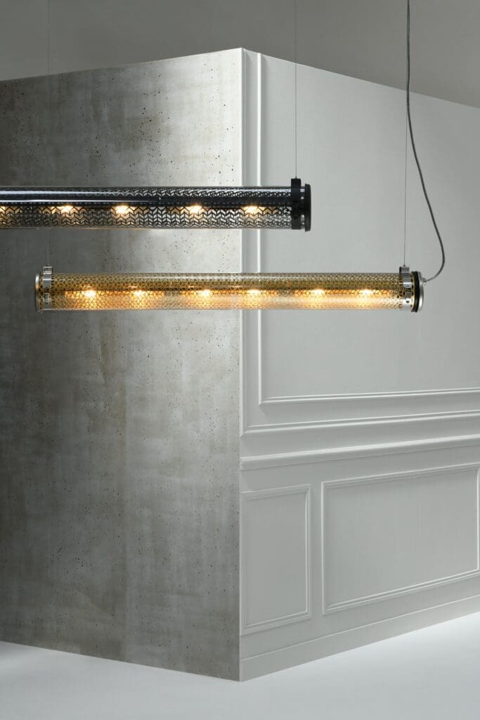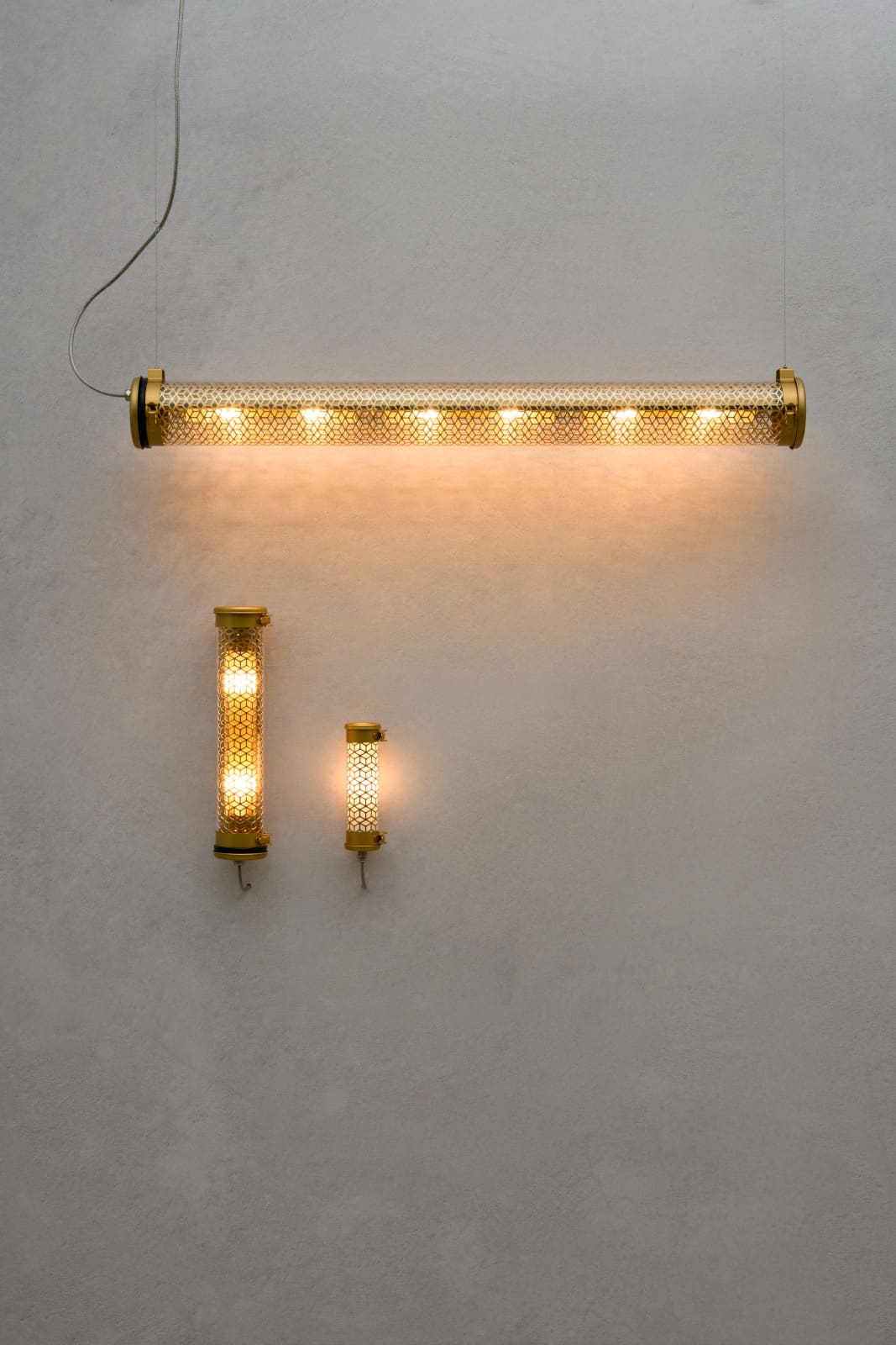 In 2018, Normal Studio created a series of perforated grids for Sammode that delicately envelop the tubular luminaires. The Paname collection has its roots in the Rivoli luminaire, designed especially for the Musée des Arts Décoratifs in Paris, where it now lights up the modern galleries. Each motif – Rivoli, Vendôme, Monceau, Belleville – has its own unique story to tell, playing with light in distinct ways, like metallic ornaments that transform the industrial character of the tube into a domestic ambience.