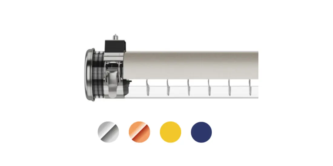 The four hues proposed for the anodised aluminium louvre play on reflections and create a range of lighting atmospheres. Opt for a brass or copper finish for a cosy atmosphere. For a classy industrial look, opt for the Silver reflector, or the Petrol version combined with the lacquered Coal black end-caps and fixing straps.