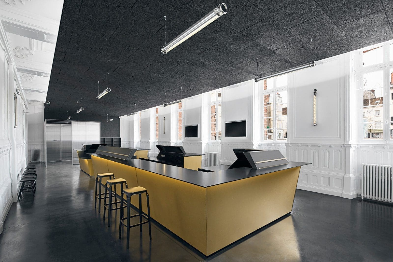 La mise en lumière des lieux de travail et des espaces studieux comme les écoles et les médiathèques doit privilégier le confort lumineux des utilisateurs. Évitez la fatigue visuelle et favorisez le bien-être avec des solutions d’éclairage fonctionnelles, efficaces et agréables. Le contrôle de la luminance est primordial pour réussir l’éclairage des bâtiments tertiaires et des établissements recevant du public. Par exemple, le Brueghel en suspension dans un bureau, une médiathèque ou une salle de classe offre un haut niveau de confort lumineux en réduisant l’éblouissement (UGR ≤ 19). Ce luminaire bénéficie d'une technologie permettant de faire varier l’intensité et la couleur de l’éclairage de blanc froid à blanc chaud en fonction du moment de la journée. L’éclairage général peut au besoin être complété par des lampes de bureau ou lampes de tables design.