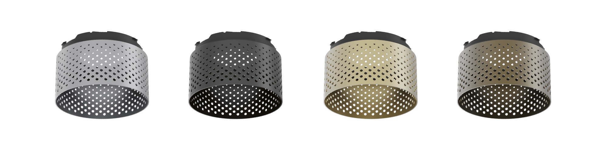 Combinez lentilles et couronnes pour créer votre lumière et votre ambiance. Dans l’intimité de votre salon, optez pour la version Champagne, sublimée par un élégant collimateur multi-perforé. Dans une cuisine moderne au style post-industriel assumé, associez avec du béton ciré les finitions Black ou Bronze avec verrines teintées.