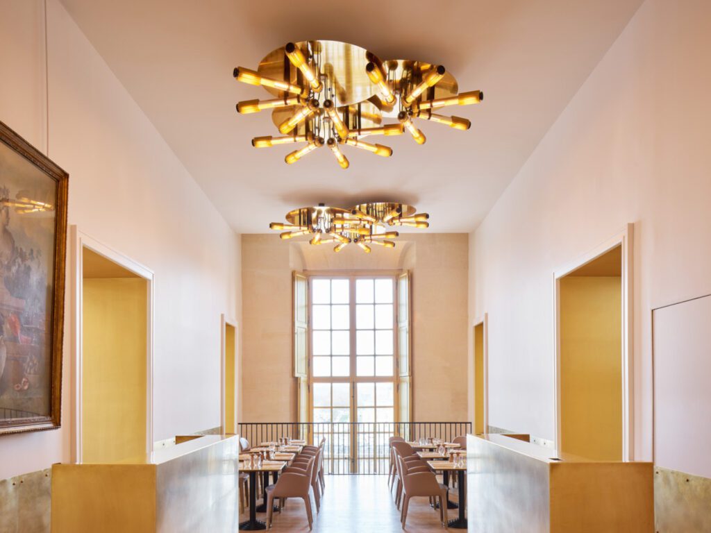 Les luminaires Sammode, au design raffiné et intemporel, viennent non seulement s’intégrer avec justesse dans cette architecture patrimoniale, mais surtout l’embellir. Leurs lignes tubulaires épousent les moulures et les dorures, révélant chaque détail sans jamais dominer l’ensemble. En diffusant une lumière douce et maîtrisée, ils participent à la création d’une atmosphère singulière, conférant au restaurant une identité visuelle forte et cohérente, au service de l’expérience culinaire.