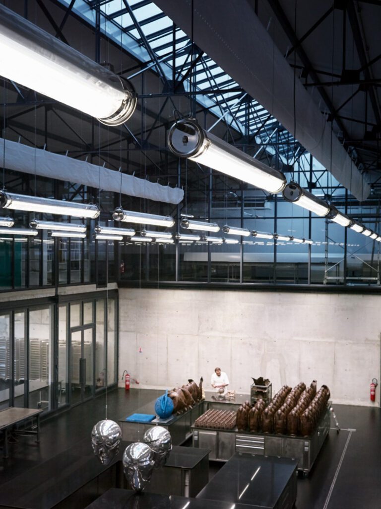 L’atelier du chocolatier-sculpteur Patrick Roger incarne une synthèse remarquable entre artisanat d’excellence, expression artistique et exigence architecturale. Conçu par PM Architecture, ce vaste espace de 700 m², baigné de lumière naturelle grâce à une façade vitrée donnant sur un jardin potager, offre un cadre propice à la création et à l’innovation.
