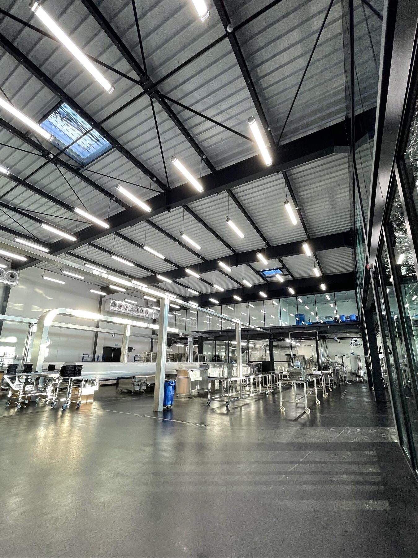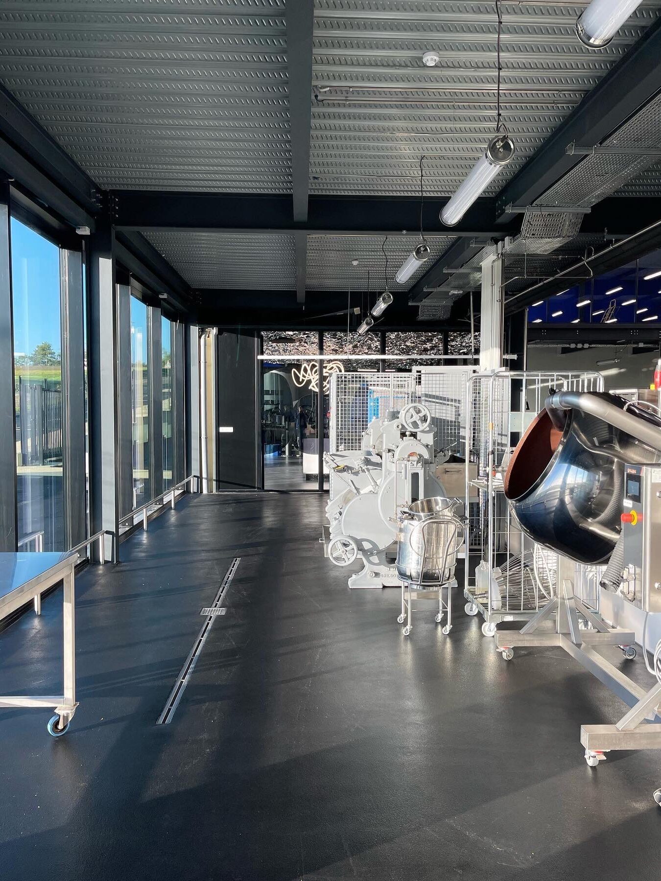 La performance lumineuse des luminaires garantit une luminosité maîtrisée, essentielle pour le travail minutieux du chocolat, tout en assurant un confort visuel optimal pour les artisans. Le design épuré et la robustesse des équipements s’intègrent harmonieusement à l’esthétique industrielle de l’atelier, mettant en valeur les matériaux bruts tels que le béton, l’acier et le verre.